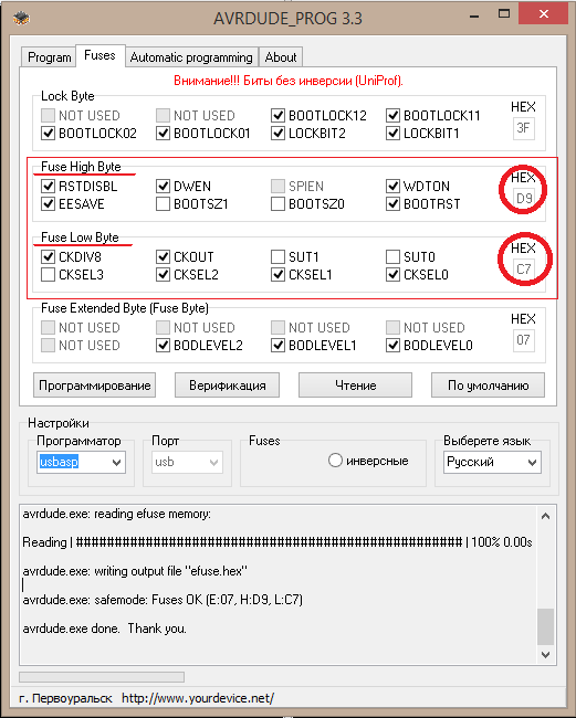 В зависимости от используемого программного обеспечения – FUSE биты могут быть инвертированы. Подходить к их установке нужно очень внимательно, т.к. можно, например, настроить МК на работу от внешнего тактового генератора, и если такого под рукой не окажется, заставить работать его будет очень затруднительно. Для настройки фьюзов я использую AVRDUDEPROG:
